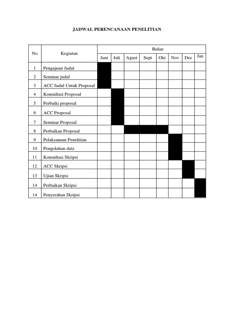 Sosial ekononomi dan budaya, departemen pendidikan dan kebudayaan. Tabel 4.2 jadwal penelitian no uraian kegiatan sep 13 okt 13 nov 13 des 11 jan 14 feb 14 mar 14 apr 14 mei 14 jun 14 jul 14 1. Jadwal penelitian yang melputi persiapan, pelaksanaan dan pelaporan hasil penelitian dalam bentuk bar chat. Matriks jadwal pelaksanaan penelitian jasa pembuatan skripsi dan pada jadwal penelitian disusun berdasarkan . Adapun untuk proses pelaksanaan penelitian dalam penulisan skripsi yang kerabkali ditemukan . Contoh surat persetujuan dewan komisaris (2014). 9 contoh kuesioner skripsi penelitian kinerja karyawan. Proposal penelitian industri qc intansyefira05. Proposal seminar proposal skripsi pelaksanaan penelitian penyelesaian. Berikut data lengkap tentang contoh jadwal penelitian dalam proposal skripsi. Kegiatan penelitian ini direncanakan berlangsung selama enam bulan dengan alokasi waktu seperti tercantum dalam tabel dibawah ini:. Djoko suryo, 1985, gaya hidup masyarakat jawa di pedesaan: